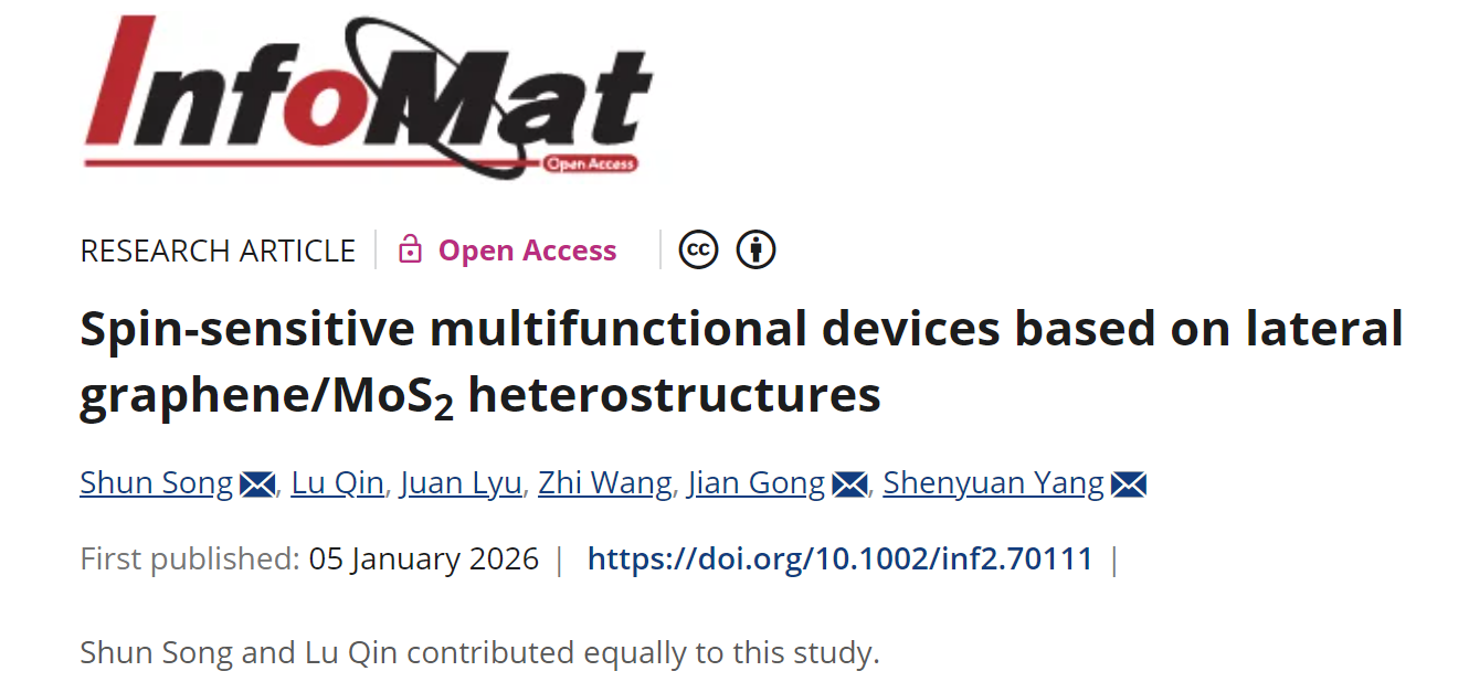 近日,我院宫箭教授团队在中科院一区Top期刊InfoMat(IF:22.3)发表题为“Spin-sensitive multifunctional devices based on lateral graphene/MoS2 heterostructures”的研究成果。研究揭示了石墨烯/二硫化钼平面异质结的磁多功能特性,为基于二维平面异质结的高性能、多功能器件设计与性能调控提供了理论依据。团队青年教师宋顺副研究员为第一作者,2023级博士生秦璐为共同第一作者,宫箭教授和中国科学院半导体研究所杨身园副研究员为共同通讯作者,388vip太阳集团为第一完成单位。