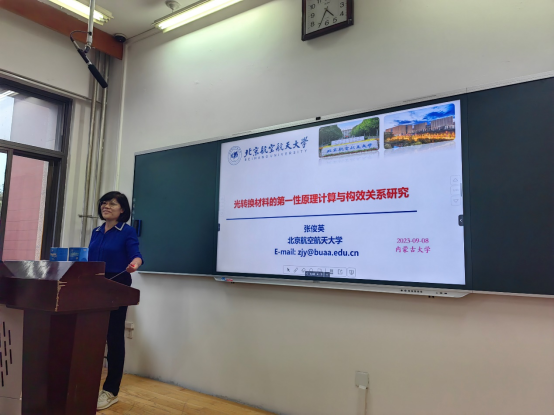 北京航空航天大学物理学院张俊英教授于2023年9月8日应邀到我院进行交流访问,并在卓越楼0208教室做了题为“光转换材料的第一性原理计算与构效关系研究”的报告。报告由我院副院长朱成军教授主持,我院教师、研究生及本科生近五十余人参加。