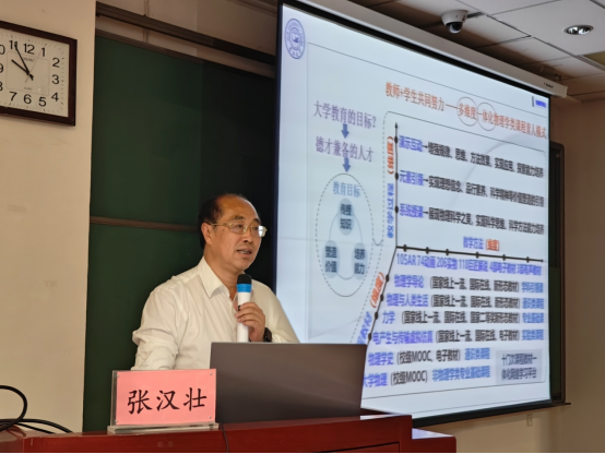 为了引导2023级新生对物理学的宏观认识,为后续专业课程的学习奠定坚实基础,本次新生见面会特别邀请吉林大学物理学院张汉壮教授为2023级新生讲授“物理学导论”,开启物理专业学习的大门。授课伊始,张汉壮教授即通过别具一格的授课方式和独特的人格魅力将同学们引入生动的物理世界,他首先深入浅出地为同学们介绍物理学课程体系基础,通过对物理学科框架和逻辑的讲授加深了同学们对物理专业学习的思想认知,为同学们建构起了科学合理的知识体系。随后张汉壮教授通过授课视频、VR等教学手段立体地为同学们呈现物理现象,极大提升了同学们对物理学习的兴趣。授课全程,张汉壮教授循循善诱、寓教于乐,现场响起多次热烈掌声。最后,张汉壮教授寄语新生:“态度决定一切,高度决定视野,希望同学们成为有感恩之心、立报国之志,担时代职责的国之栋梁!”
