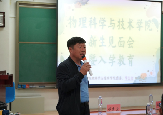 学院党委书记邓秀全首先对2023级新生的到来表示热烈欢迎,随后强调了日常事务管理、校园安全管理等,希望同学们提高安全防范意识,加强纪律意识,遵守校规校纪。最后邓秀全书记鼓励同学们要珍惜时光、做好自我规划与管理,不负青春、不负韶华。